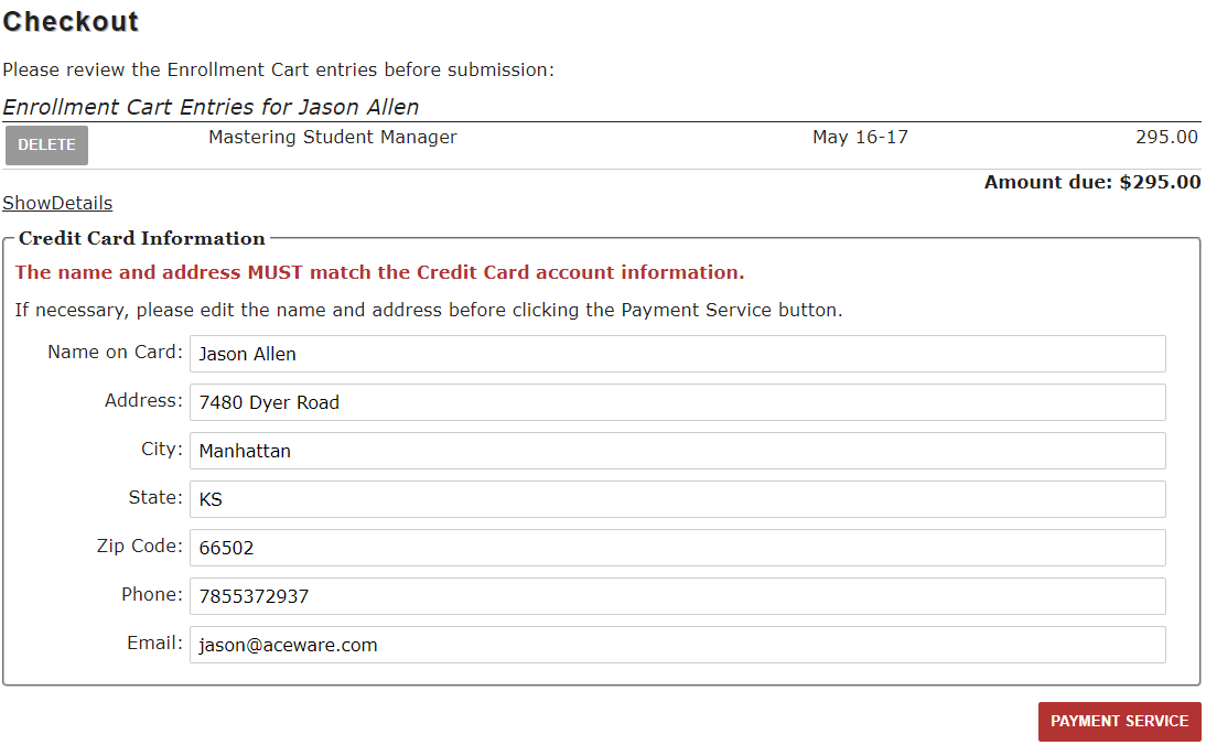| ##-Card Info Section-## | Messages and data displayed in the Credit Card Payer Information section. The logged on user's information is displayed by default. The user can edit the information before clicking the Payment Service button (e.g. if they are paying with a 3rd party credit card.) |