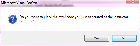 - When you are formatting the description, click the Done button. That will close the Editor window and return you to the Faculty window, and ask if you want to generate the HTML code and enter into the HTML field. Click the Yes button to generate the HTML.